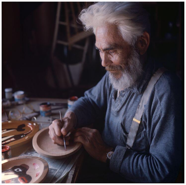 Image of an older man painting wooden bowls or plates.
